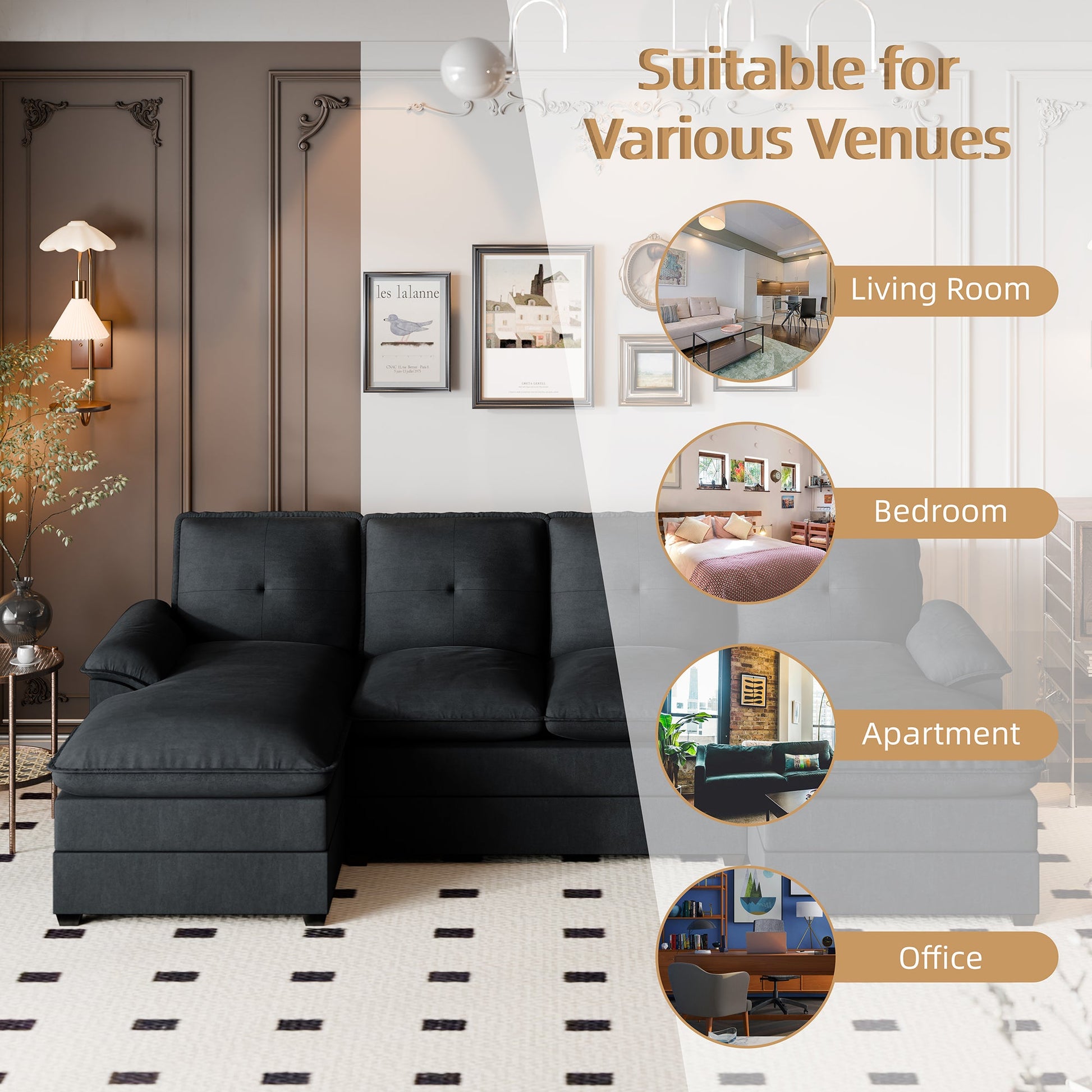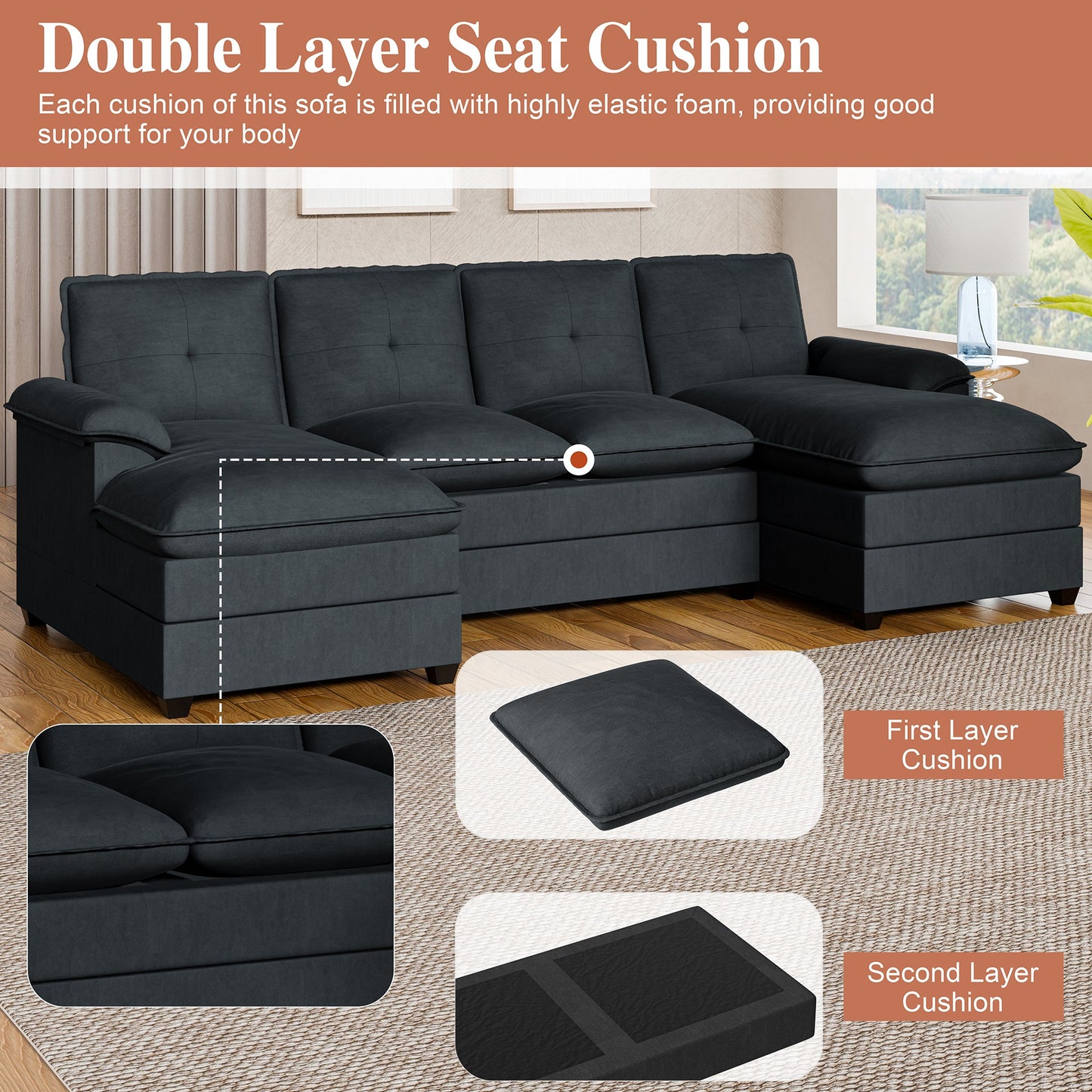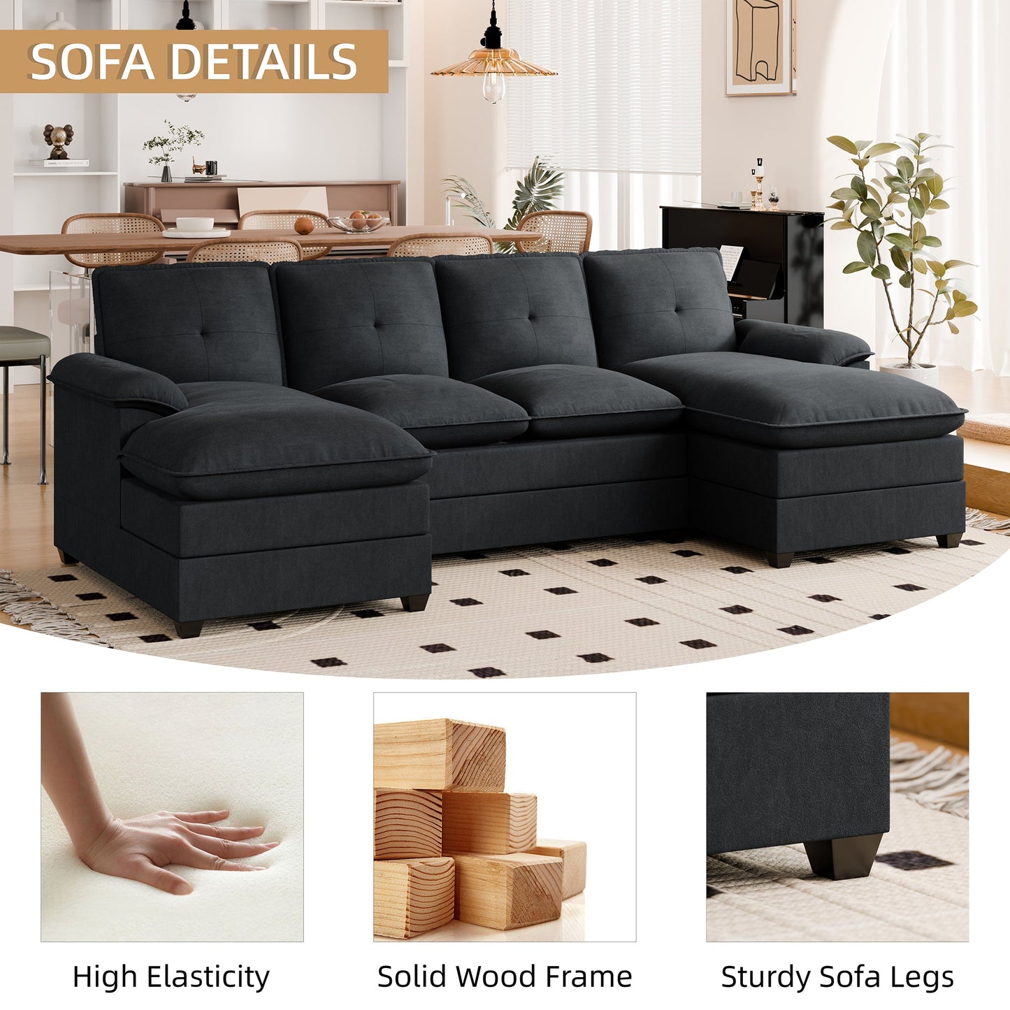 Designed for durability, the frame of this sectional couch is made from premium solid wood, providing steadfast support. The sleek black solid wood legs not only ensure stability but also add a touch of elegance, guaranteeing a lifetime of comfort and style.