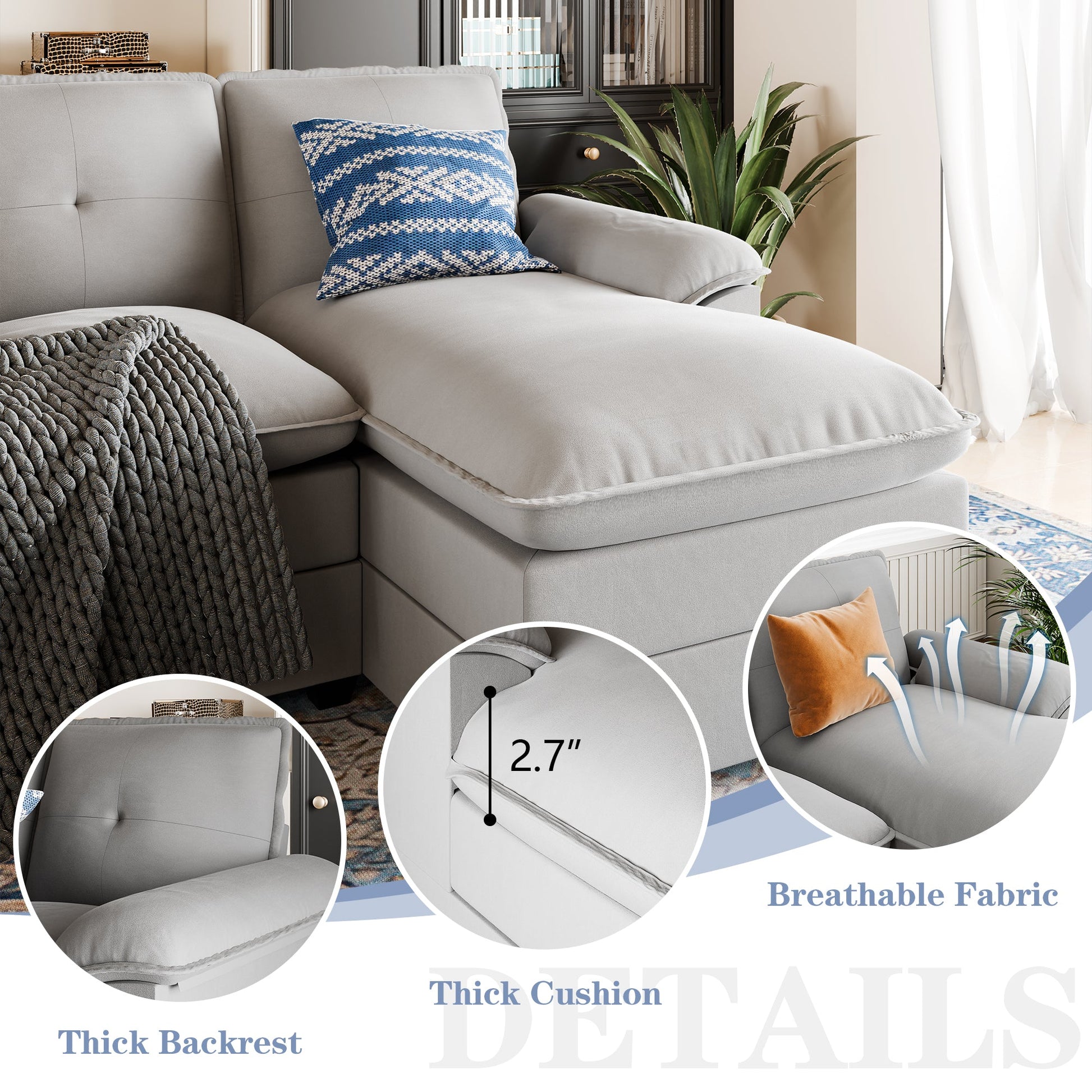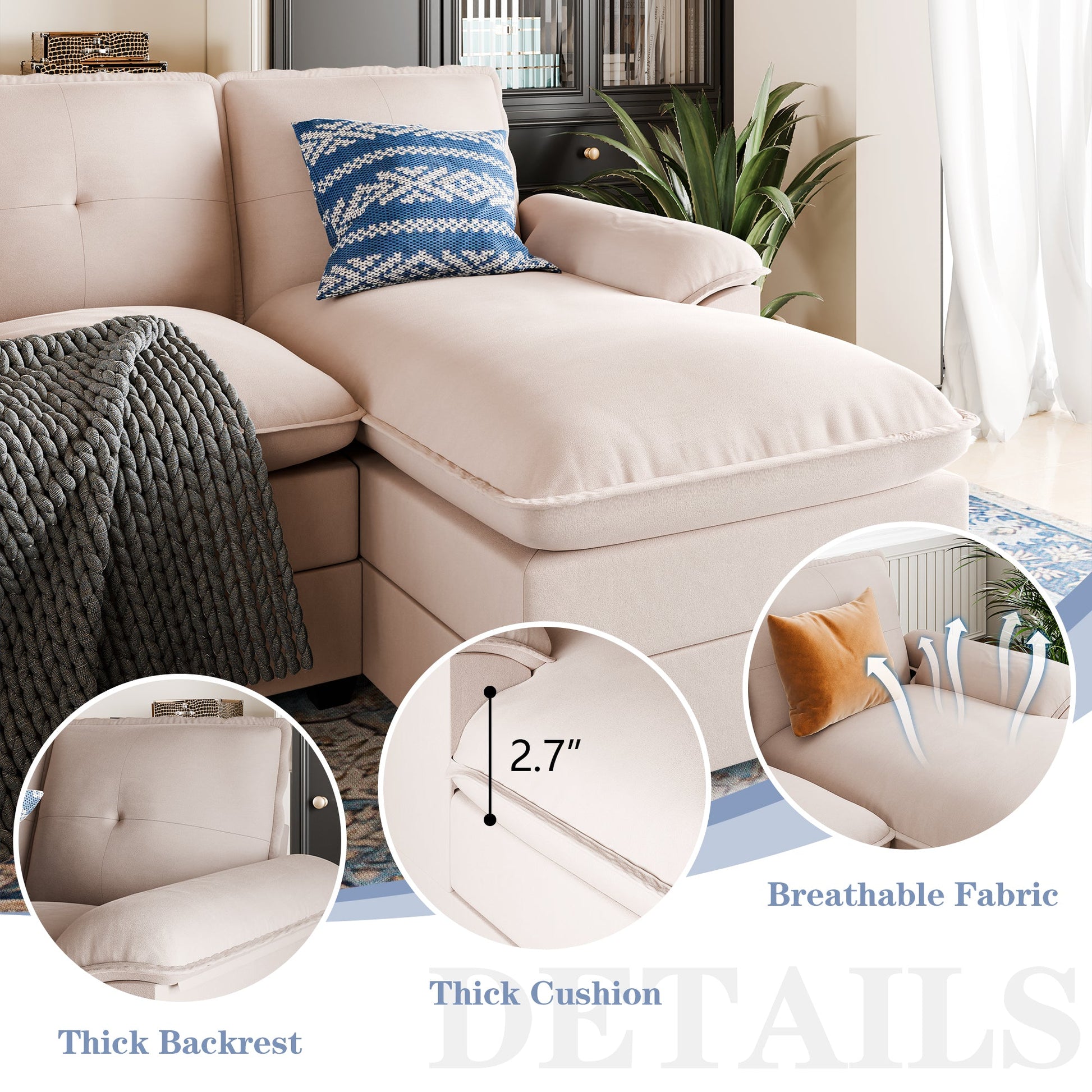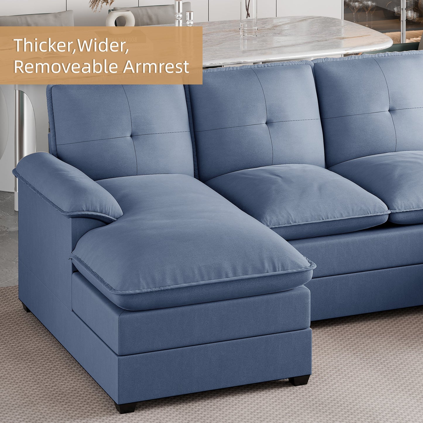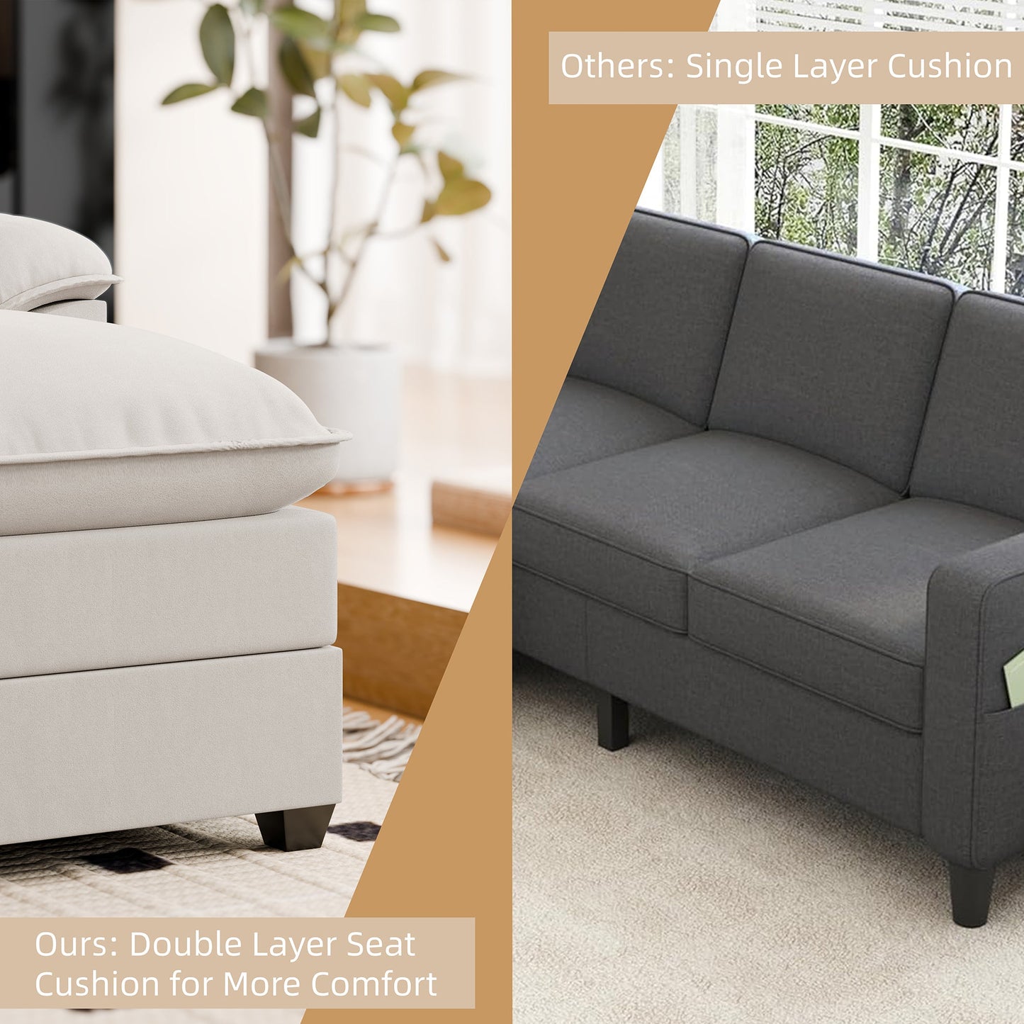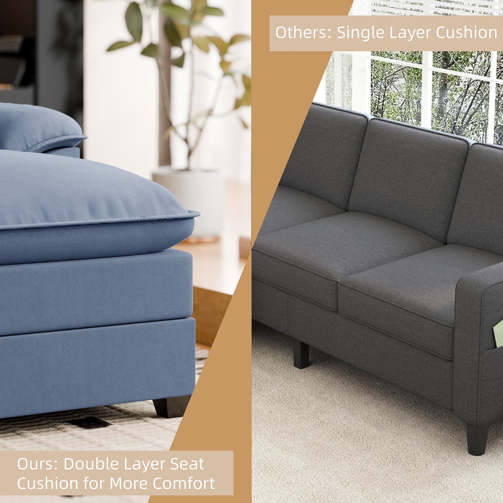 The Cloud Sectional Sofa invites you to drift away into a realm of comfort with its sumptuous dual-layer seat cushions, crafted from high-resiliency foam. Imagine sinking into the plush embrace of a cloud, where every moment feels like a dream. With its expansive design and welcoming armrests, whether you're lounging, reading, or napping, this deep sectional sofa promises an ethereal experience of unparalleled comfort.