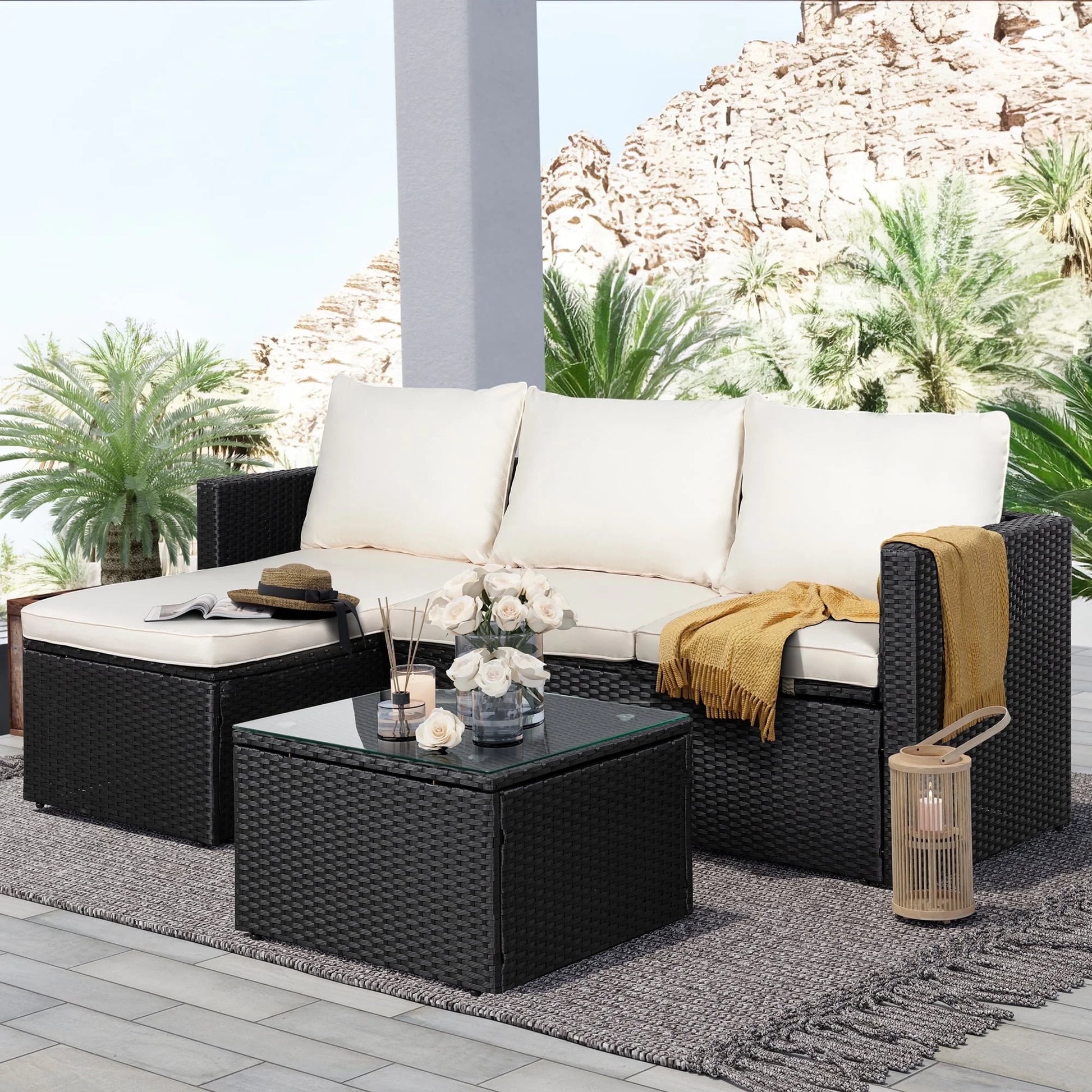 Walsunny 3 Piece White Outdoor Furniture Sectional Sofa Patio Set with Black Rattan Wicker