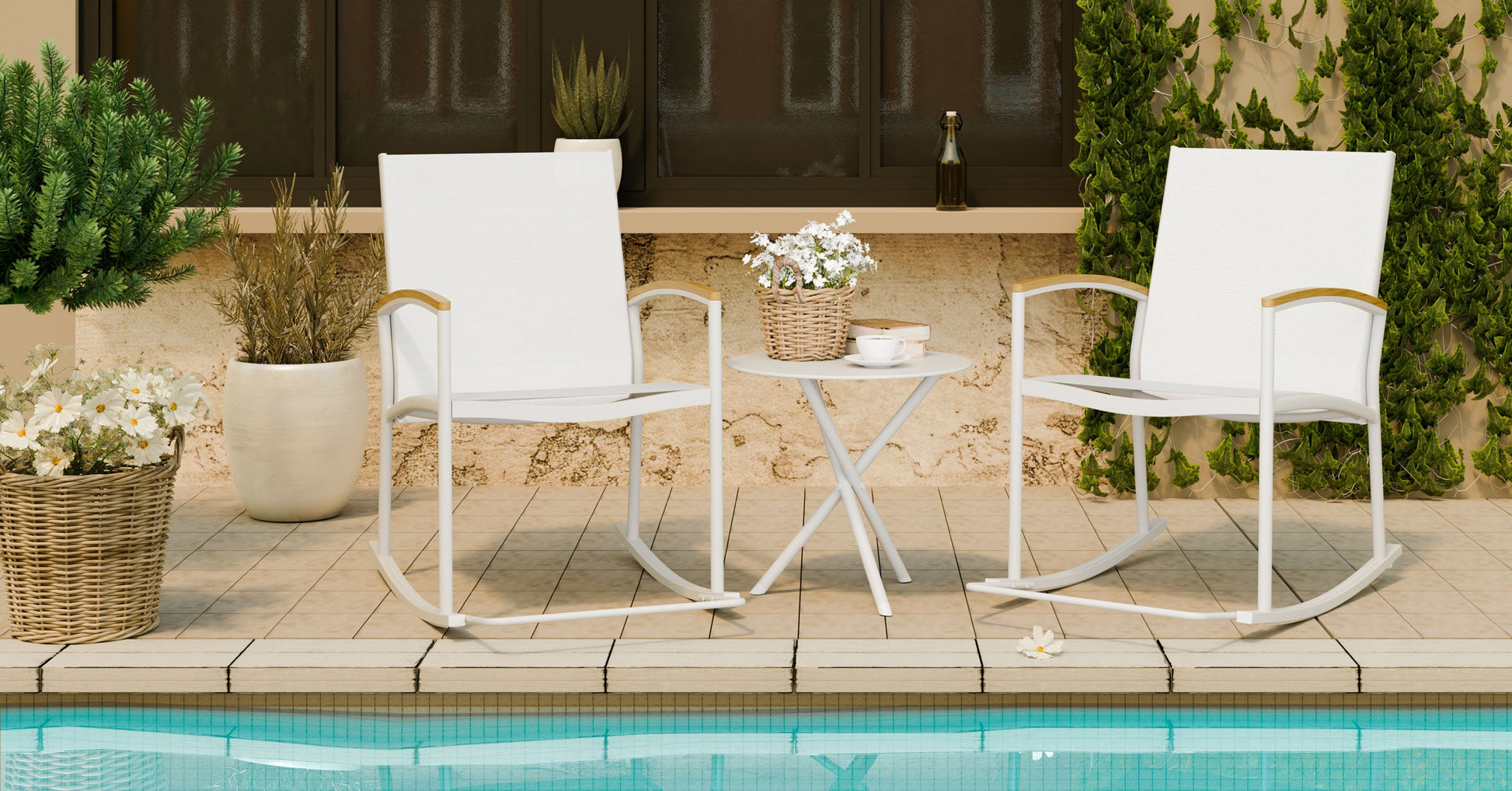 - Comfortable Patio Furniture Set: This 3 piece patio furniture set includes two chairs and a coffee table. Added rocking feature to rock yourself into a state of relaxation.