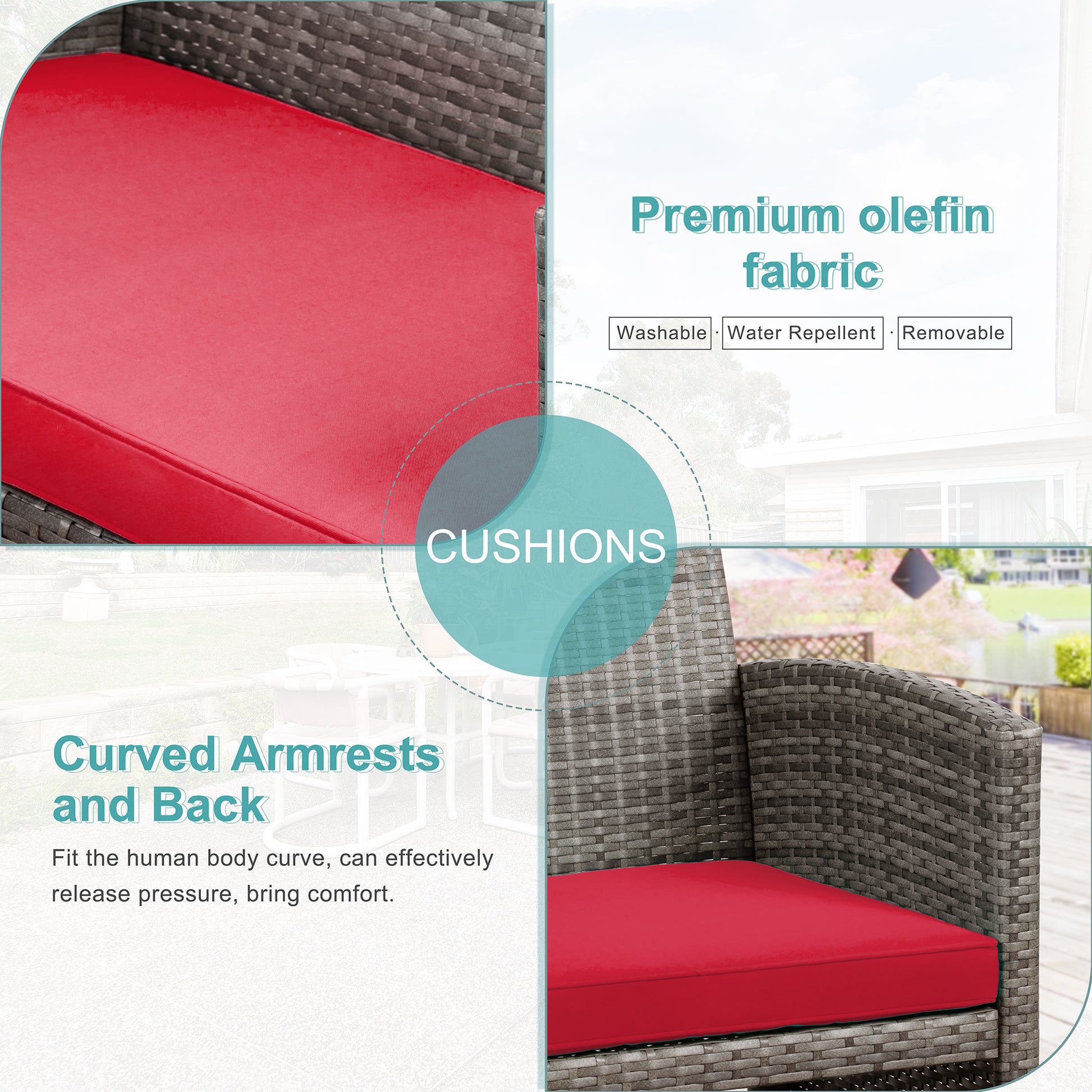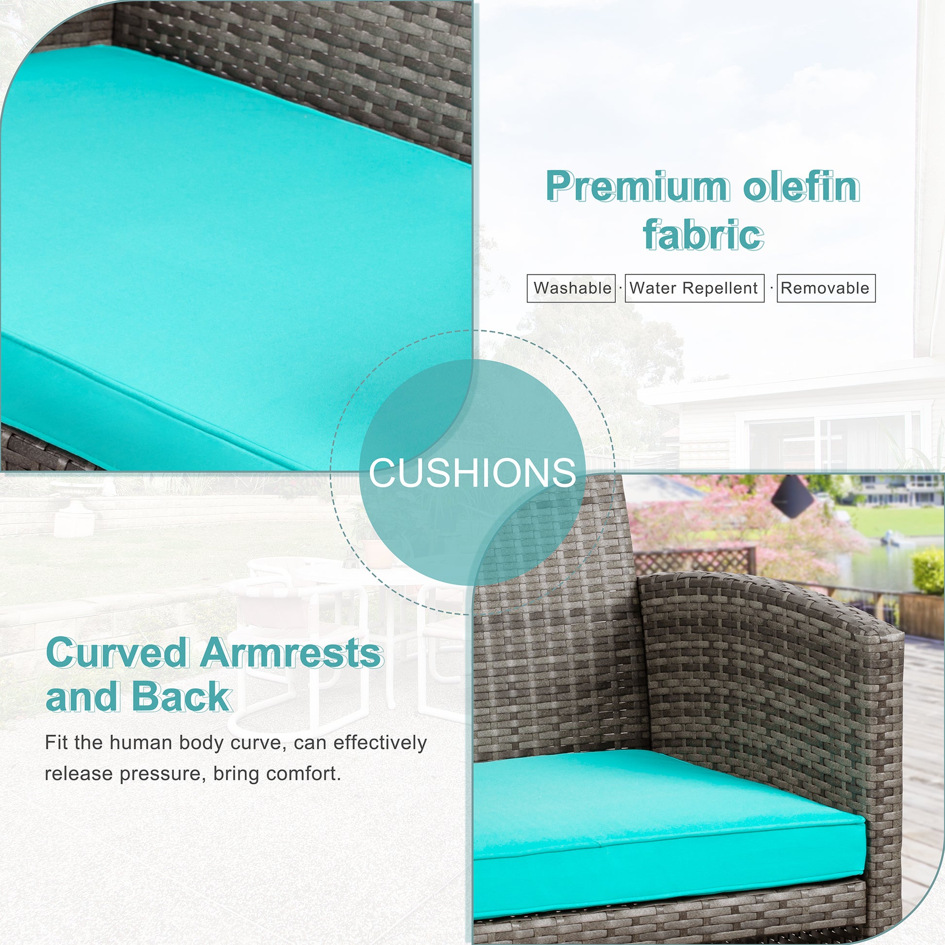 【Ergonomic & Comfortable】Our patio conversation furniture set has an ergonomic curved armrest and backrest to reduce stress in sedentary and immerse yourself in an enjoyable outdoor time. The sofa set has a padded seat cushion to provide a comfortable sitting experience. Zippered cushions are easy to clean and maintain.