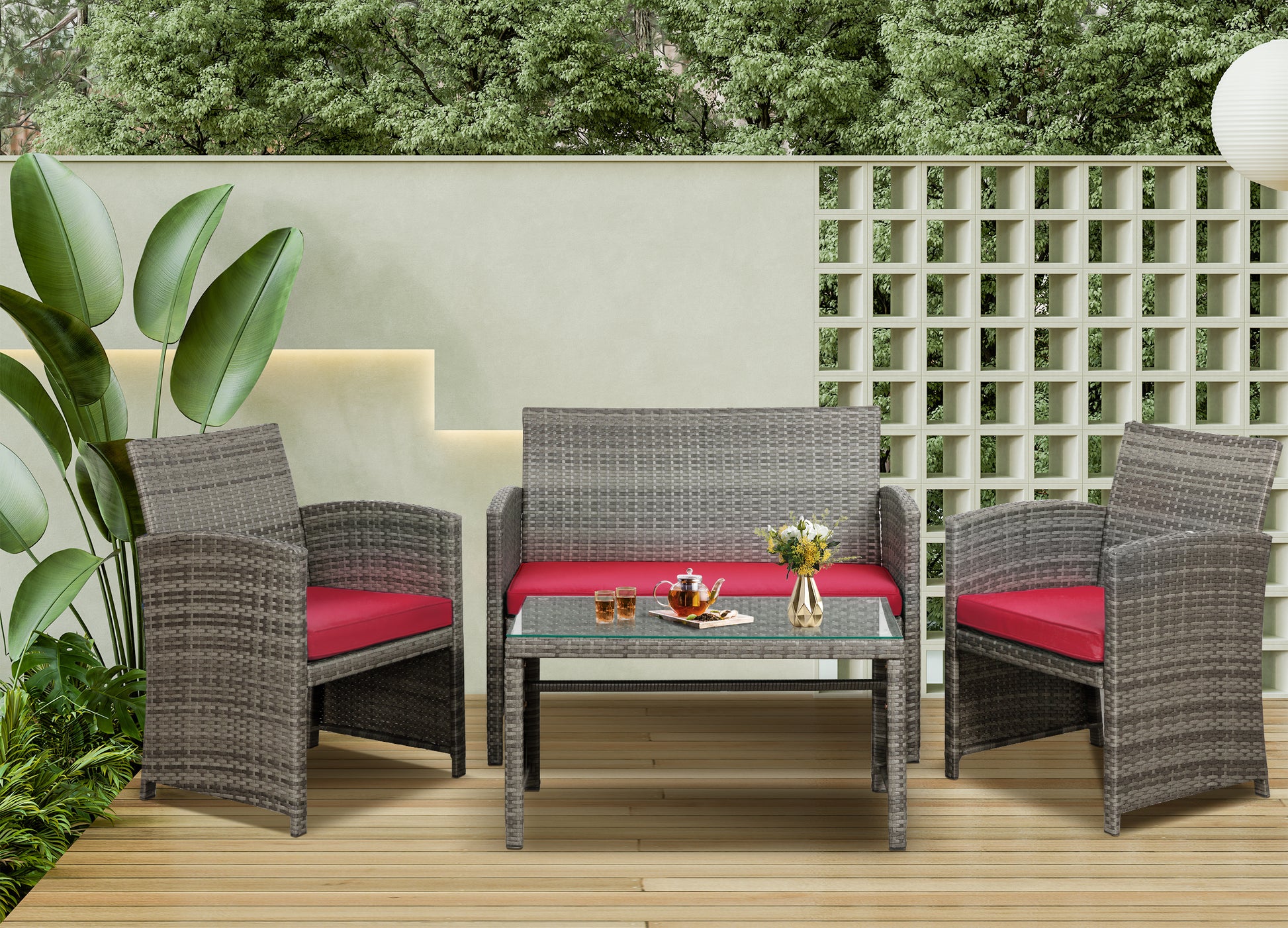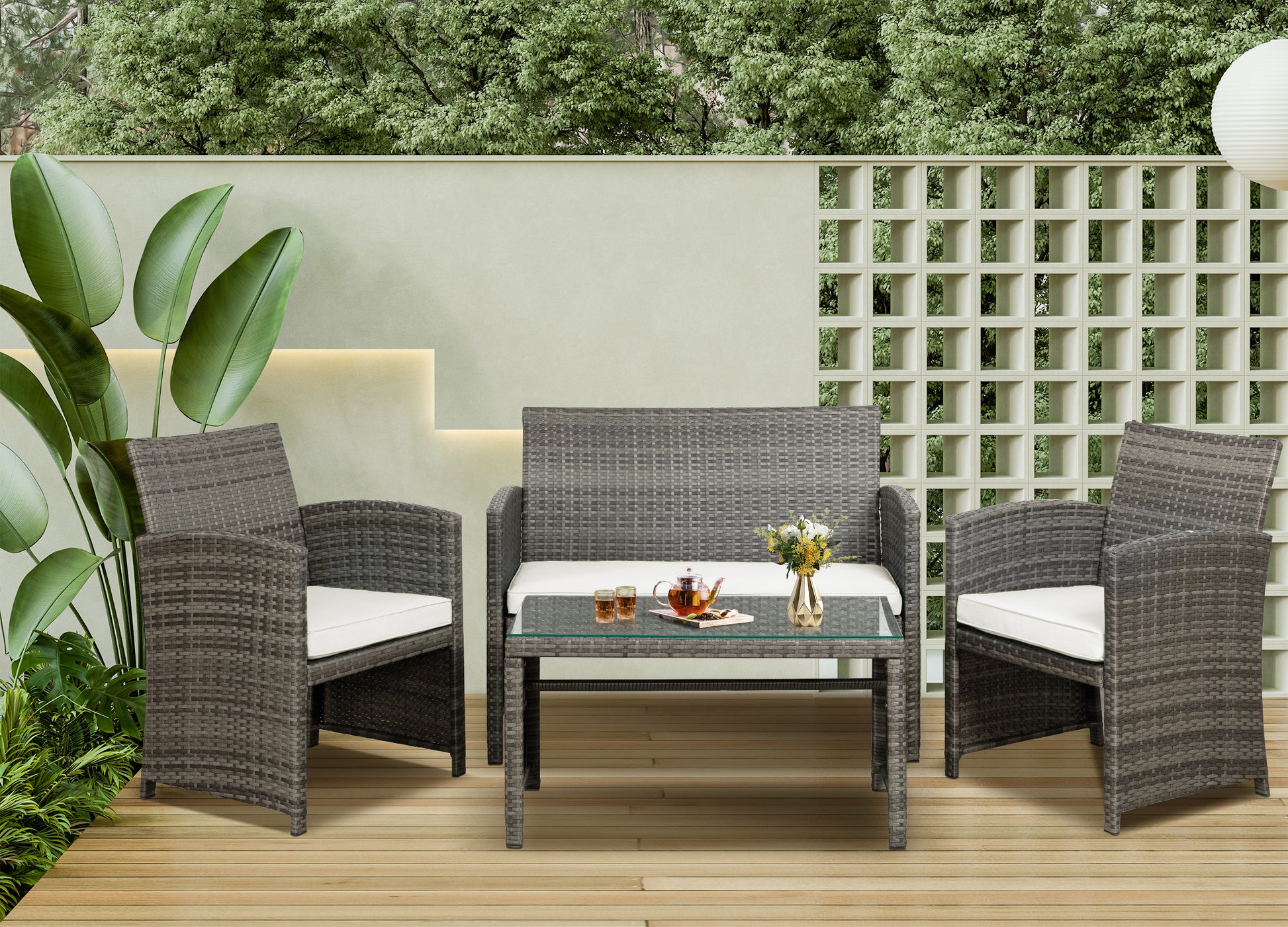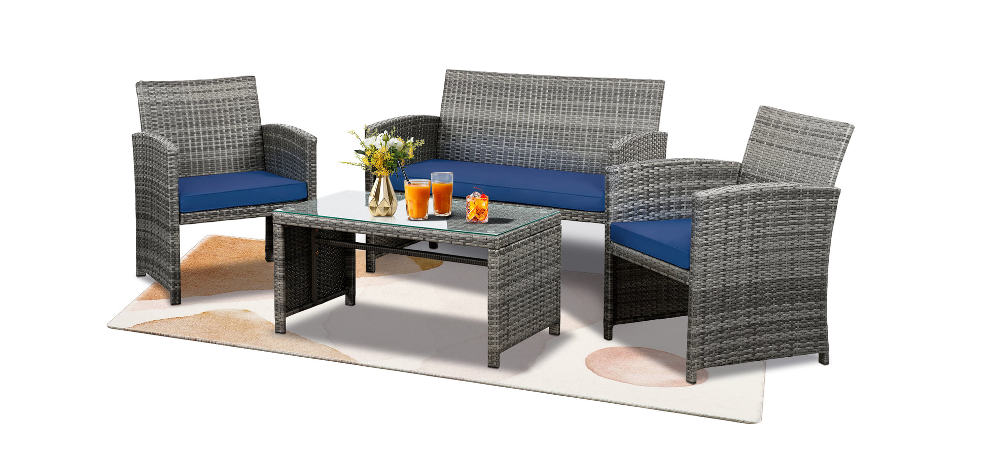 【Exquisite Tempered Glass Table】Our outdoor four-piece set comes with a coffee table with a tempered glass top to create a smooth, sturdy surface for food and drinks; don’t worry about overturning liquids, as the glass tabletop can be restored with a simple wipe. All while adding a touch of elegance to your outdoor space.