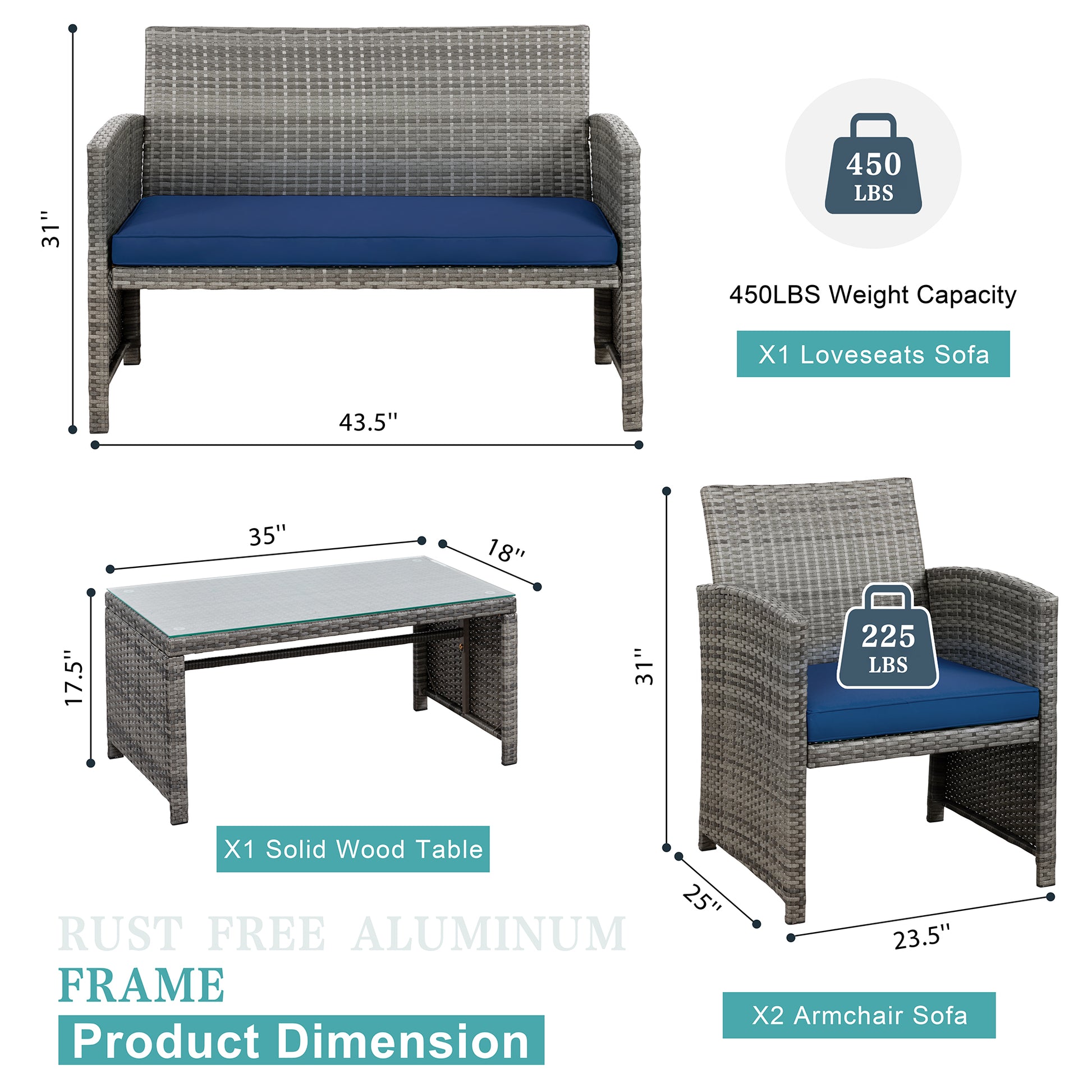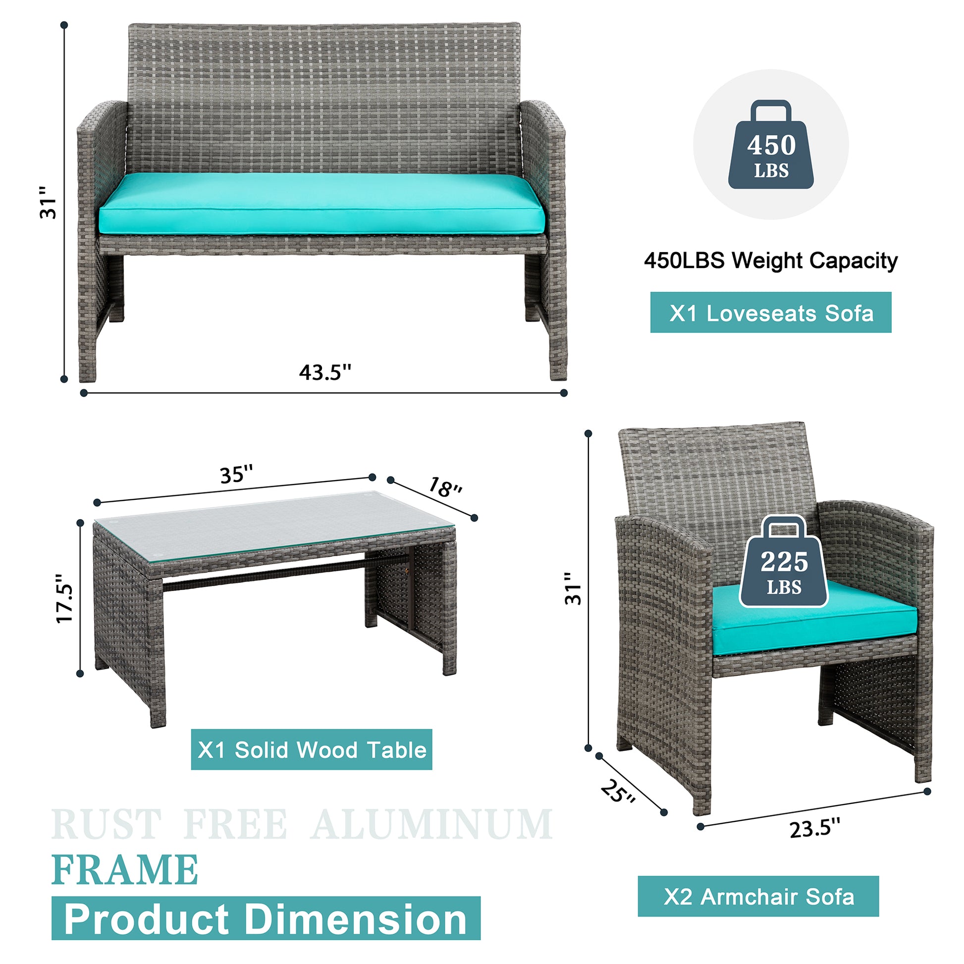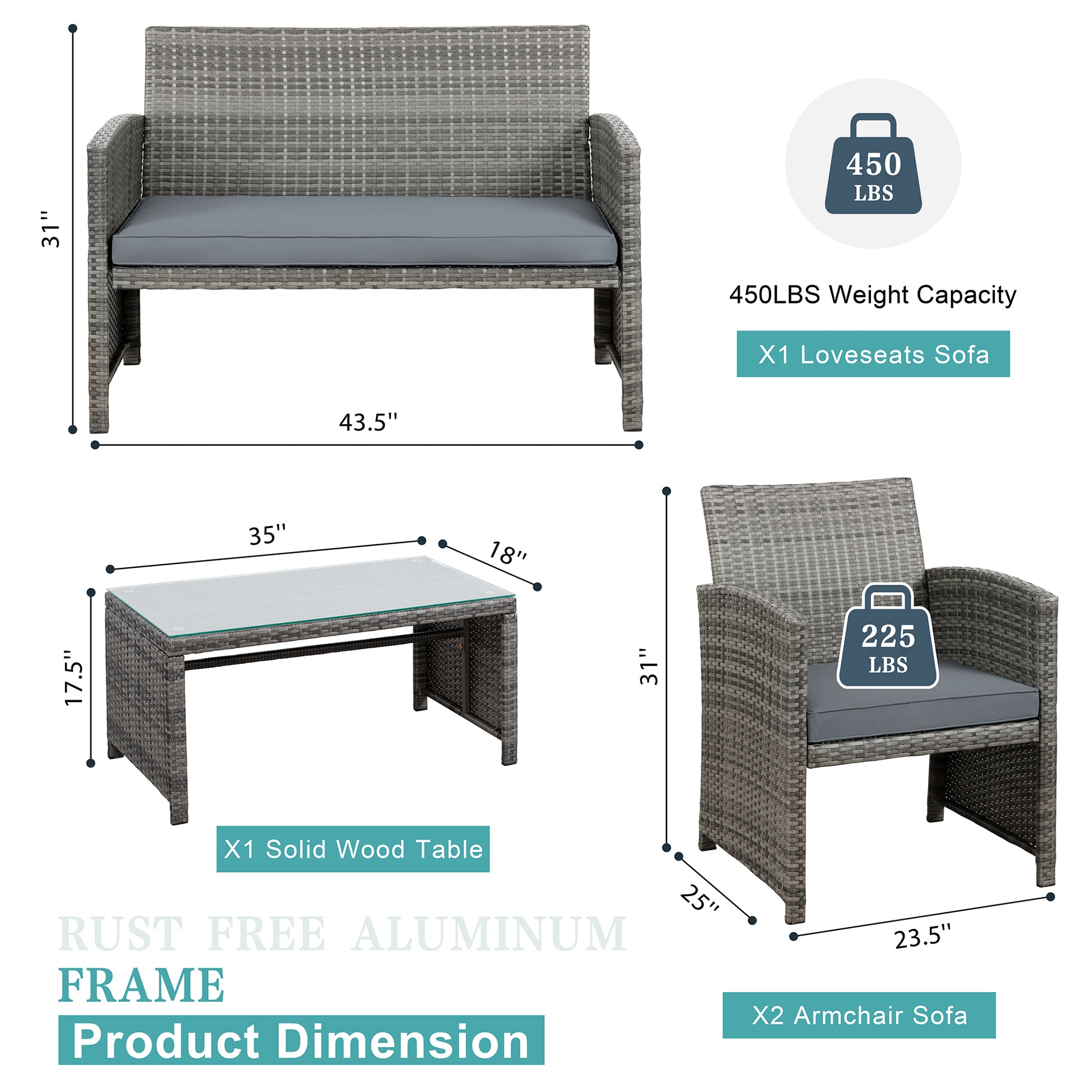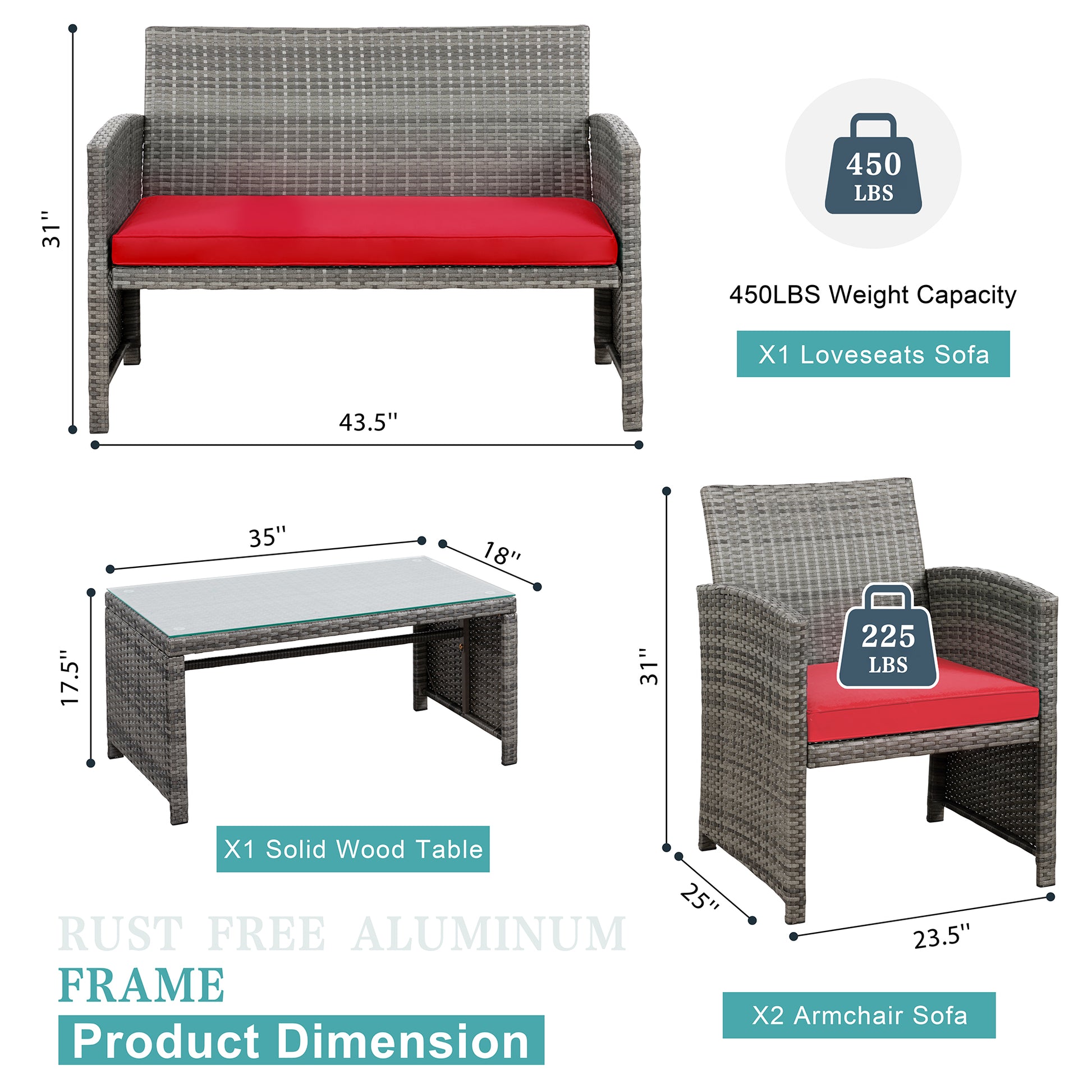 【Multiple Combination】This outdoor Sectional furniture set can be easily changed into different combinations for your patio, backyard, poolside, deck, or indoor space. Include 1 x loveseat 2 x single chairs 1 x coffee table with tempered glass tabletop 1 x double cushion 2 x single cushions.