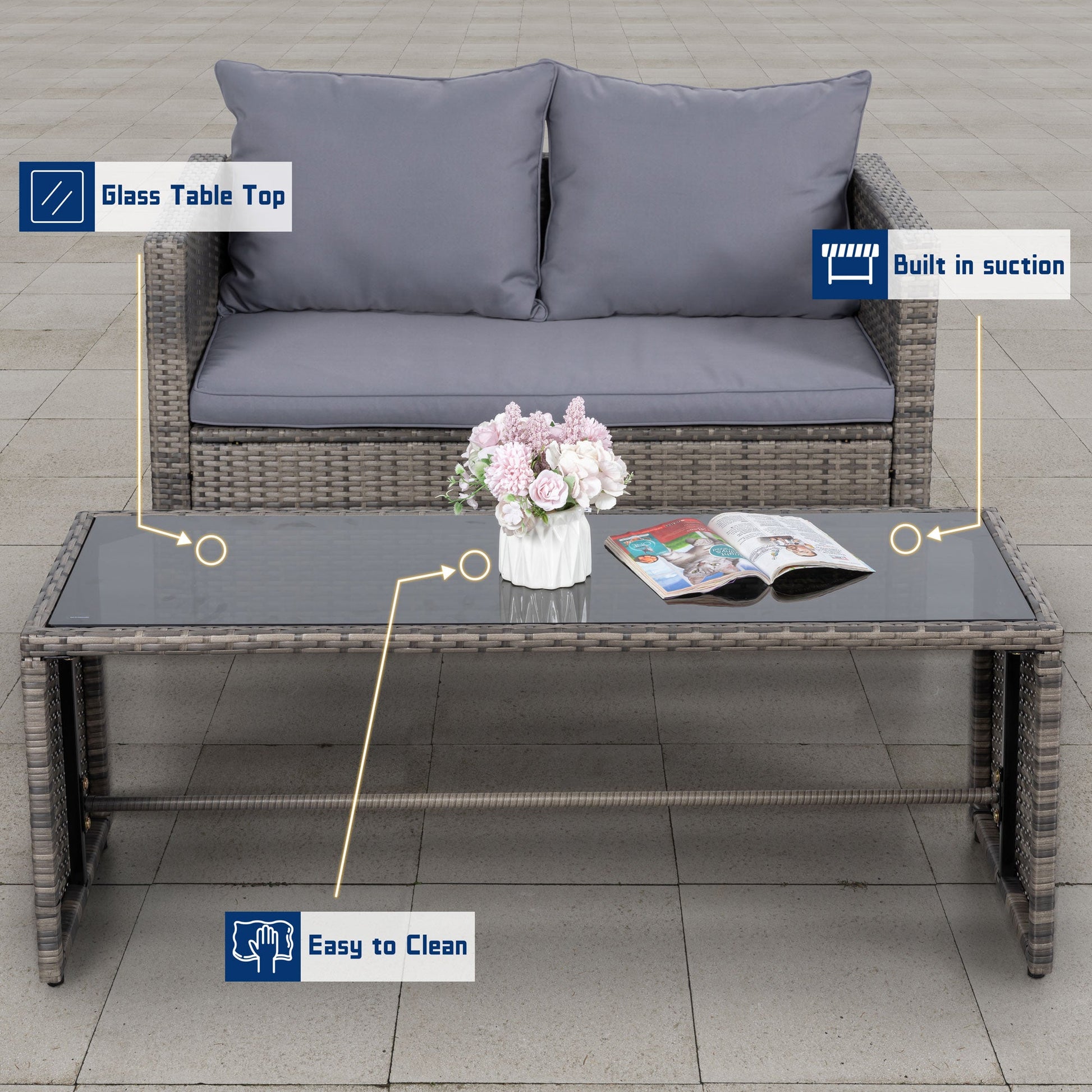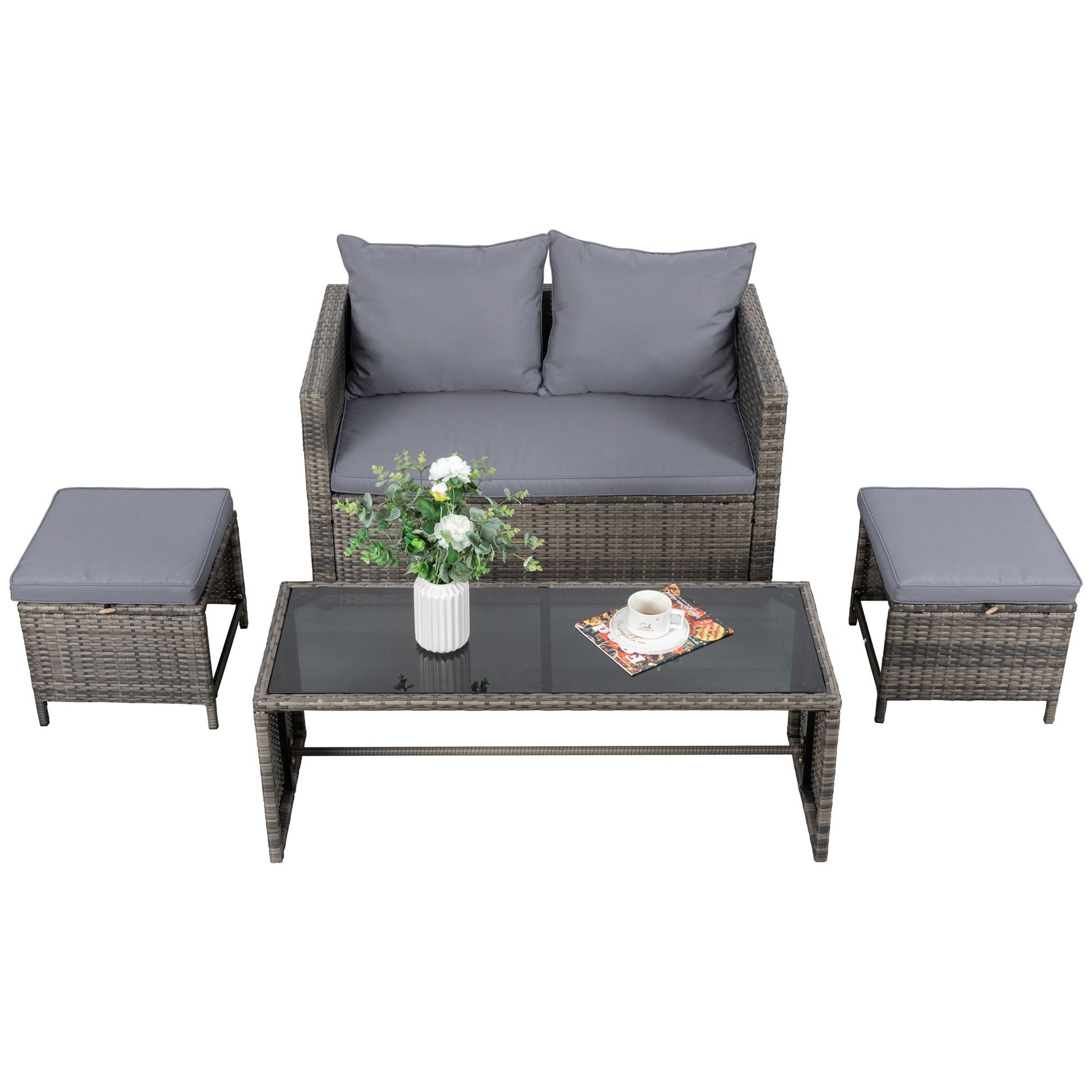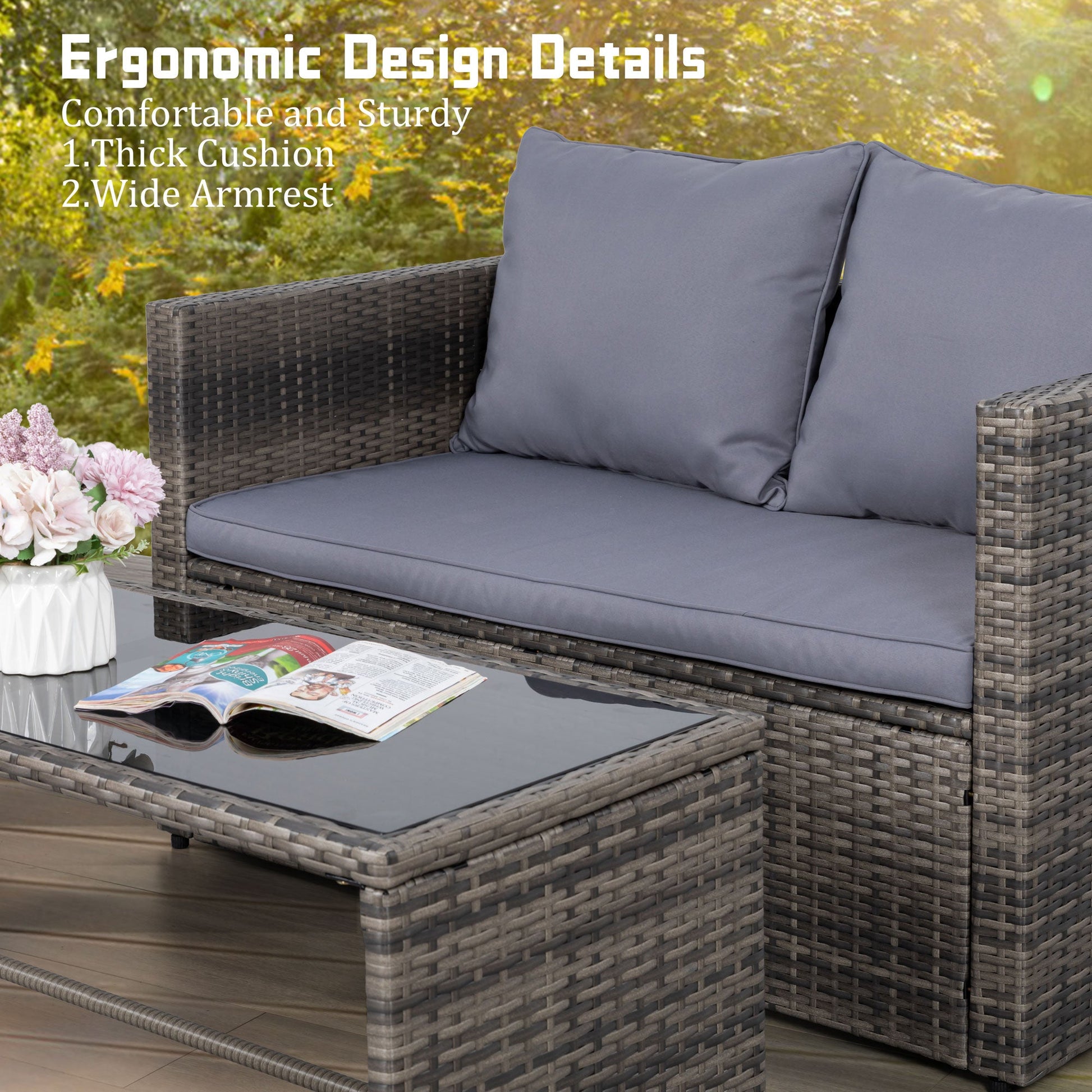 - Outdoor Loveseat: Our patio loveseat sofa stands out with its unique design, featuring 1 PE rattan table and 2 wicker chairs without a chat table between them, providing ample space for books and cups without needing additional coffee tables. Accommodating 4-5 people, it's perfect for hosting family gatherings or entertaining friends and neighbors.