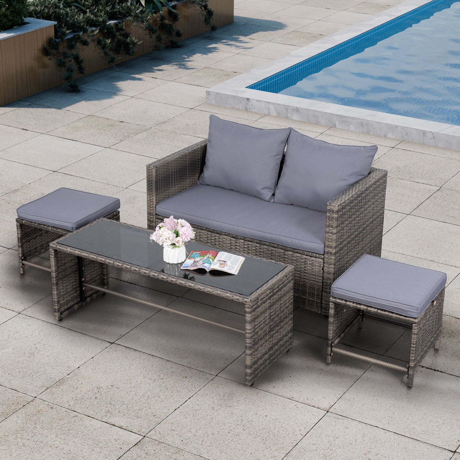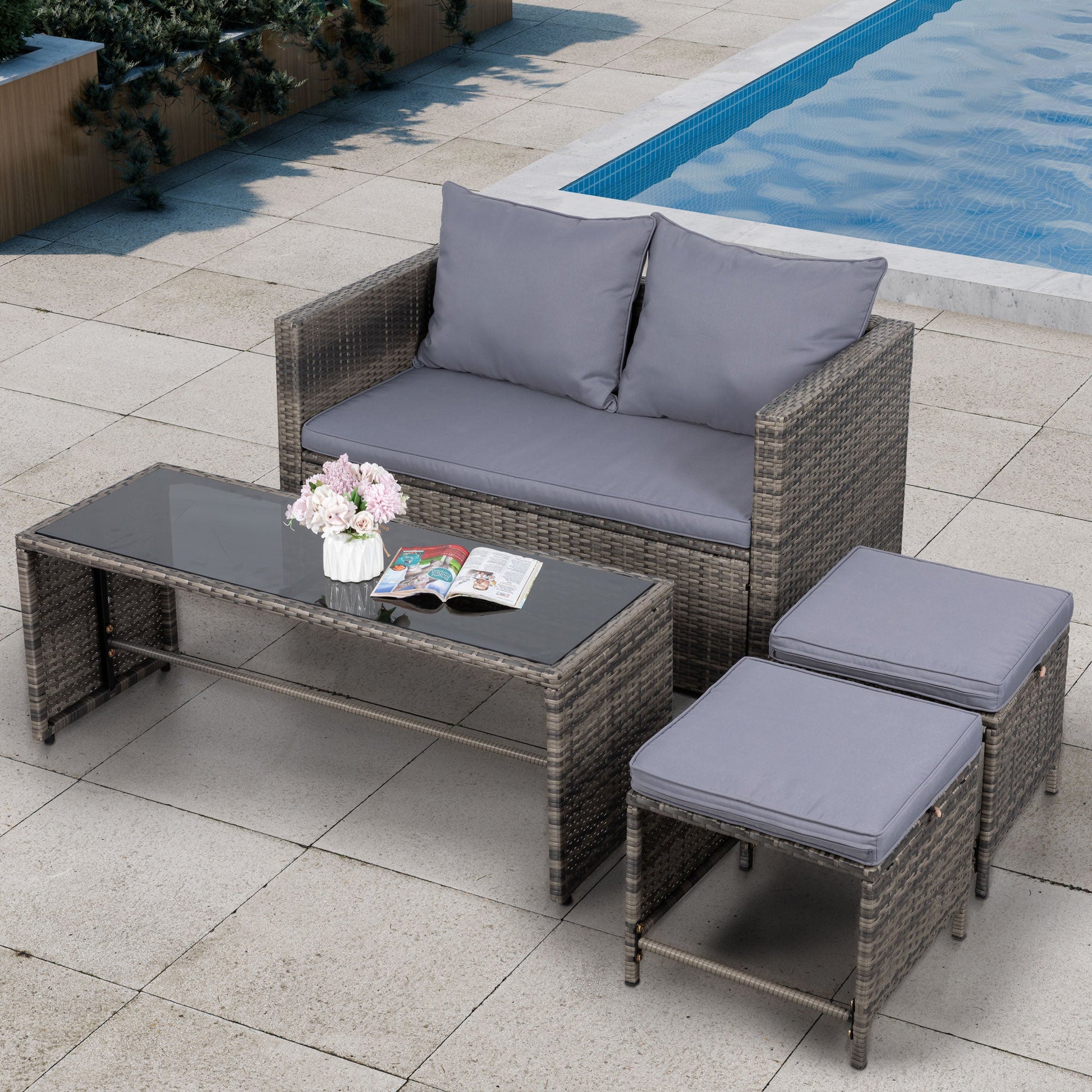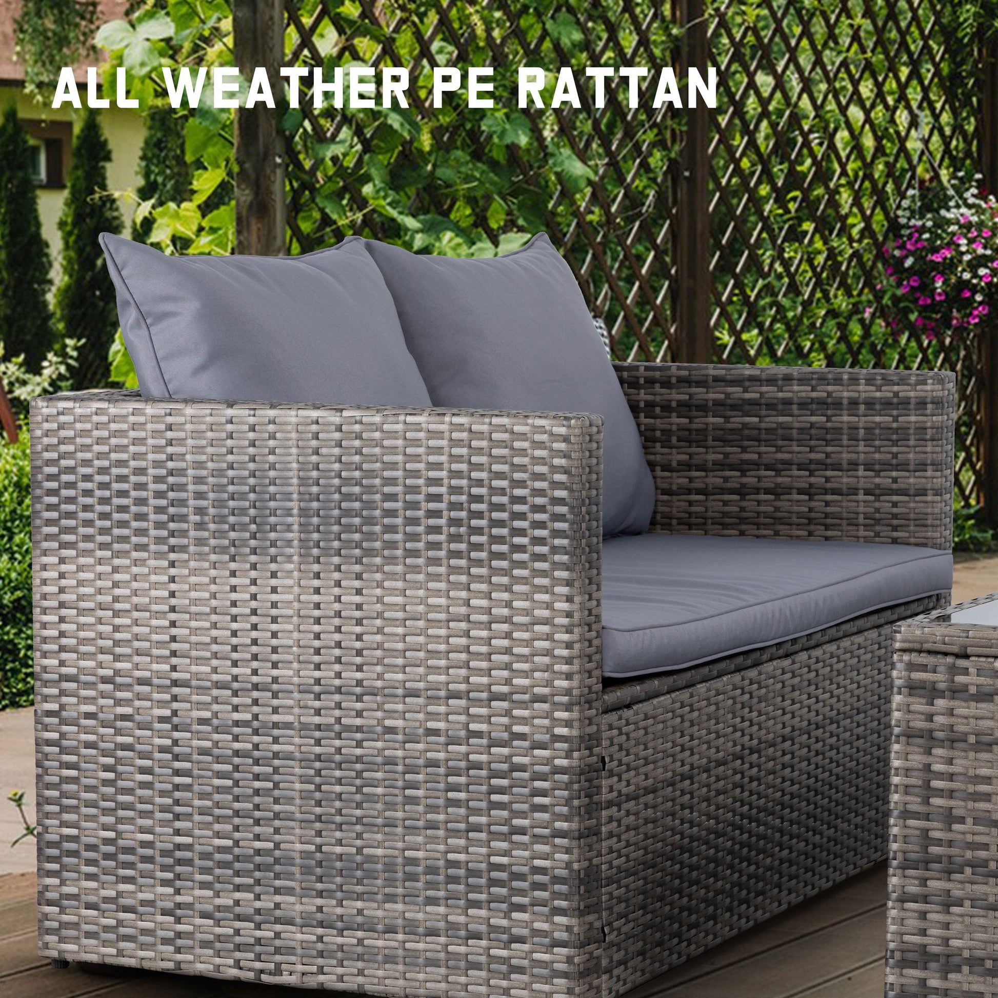 - Outdoor Loveseat: Our patio loveseat sofa stands out with its unique design, featuring 1 PE rattan table and 2 wicker chairs without a chat table between them, providing ample space for books and cups without needing additional coffee tables. Accommodating 4-5 people, it's perfect for hosting family gatherings or entertaining friends and neighbors.