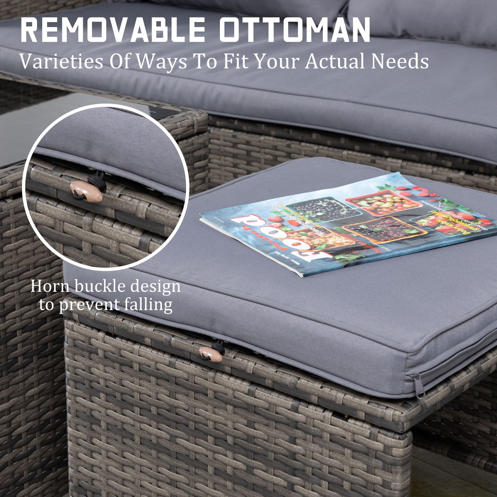 - Multisense & Sectional: Our outdoor sofa can be arranged in multiple configurations to suit different settings such as a patio, balcony, garden, or deck. The detachable cushions and long ottoman can also be used separately as extra seating or part of a chaise lounge, adding versatility to your outdoor space.