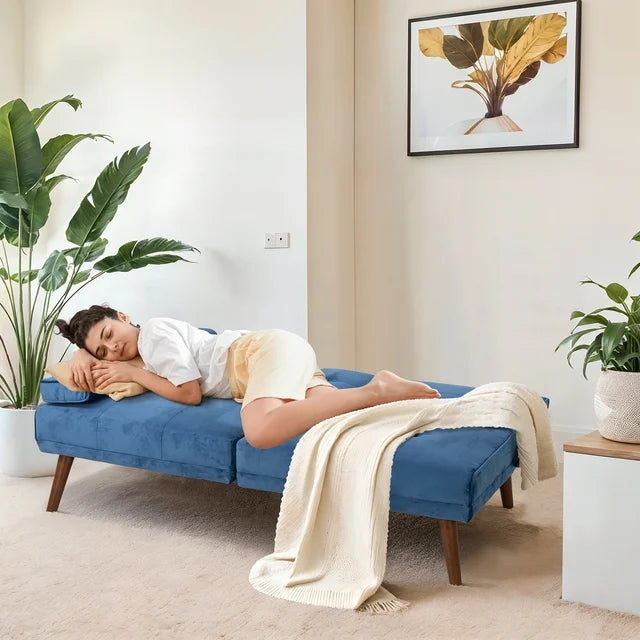The Walusnny futon sofa bed is made of high-quality velvet and a sturdy wooden frame. It is convertible, so customers can easily change its backrest angle according to their preferences: 105° for people to sit and watch TV, 140du for naps, and it can also be turned into a bed at night. Both armrests are also removable. The middle part of the sofa can be put down and has two cup holders for easy use. Featuring 6 solid wood legs, this sofa bed is durable enough to last for many years. It will be a good choice for your home decoration.