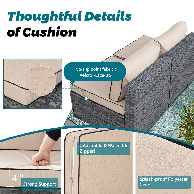 Crafted with a sturdy steel frame, the sofa is built to last, while the waterproof and breathable wicker exterior ensures it can withstand any weather conditions. The soft sofa cushions are made with weather-resistant fabric and a plush inner core, ensuring comfort no matter how long you relax. Plus, with its customizable design, you can arrange and rearrange the sofa to your liking, creating the perfect outdoor oasis for yourself and your friends.