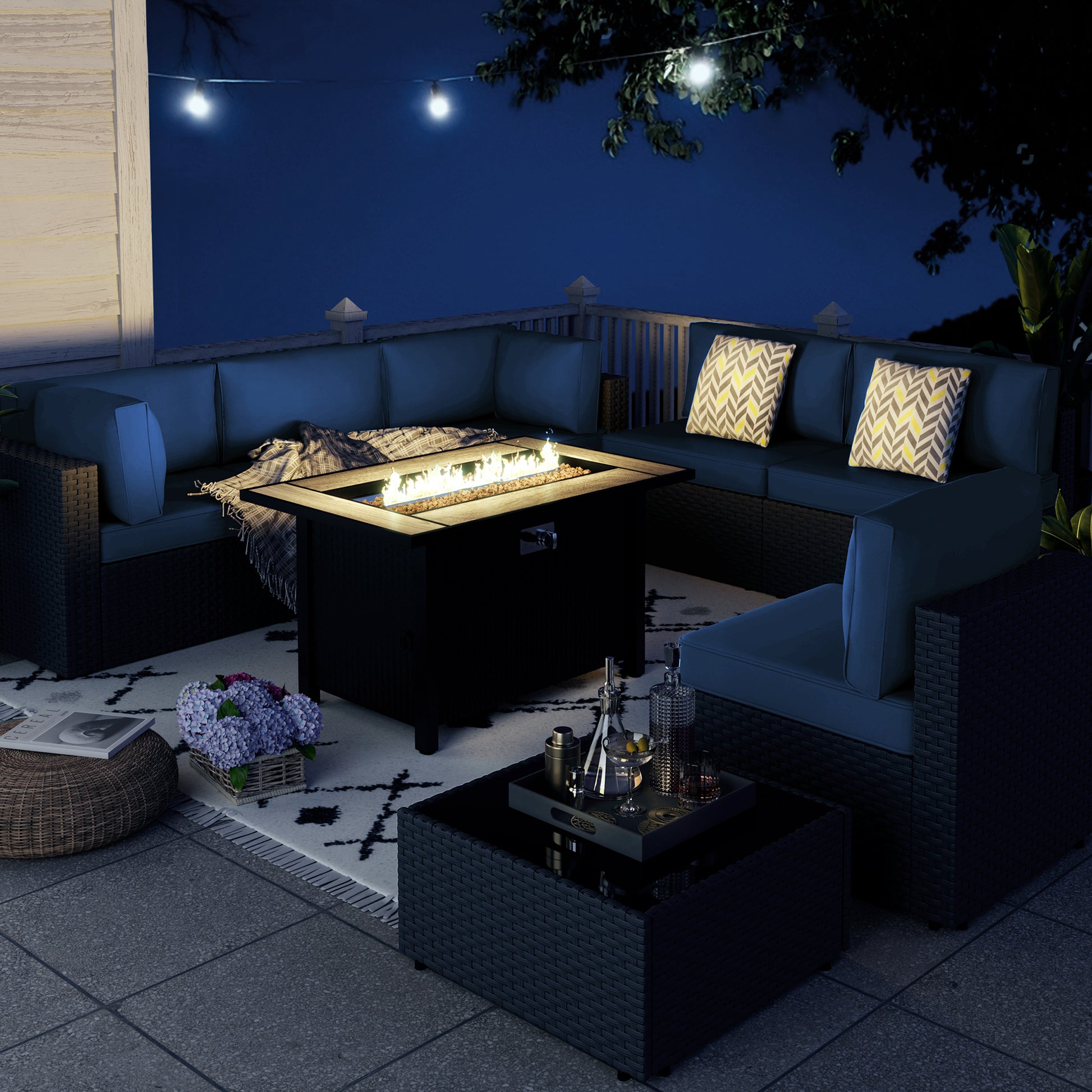 Walsunny 8 Piece Outdoor Patio Furniture Set with 45” Fire Pit Table Rattan Conversation Sectional Sets, Patio Couch with Tempered Glass Tea Table, Thickened Grey Cushions for Porch Backyard Lounge