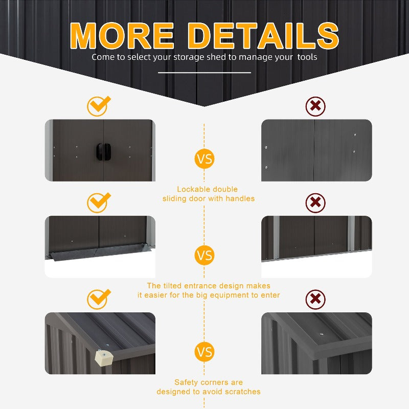 - Durable & Sturdy Sheds Storage: This storage shed with thick steel plates and deep ribs, means a strong and durable design that won’t rust or rot providing weather-resistance all year long, unlike metal or wood sheds. The design of the surface coating provides stronger quality assurance for this shed.