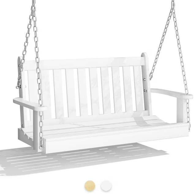 Our ergonomic swing chair offers unparalleled comfort with its curved design that embraces your body, supported by an extended backrest and optimized tilt angle. It provides ample seating for two adults, boasting stability with strong stainless steel chains and a sturdy wooden stand capable of supporting up to 800lbs. Enhanced with denser wood slats and a secure ring lock mechanism, it combines safety with elegance, perfect for outdoor relaxation. Packaged conveniently for easy assembly in under 40 minutes, it arrives protected for safe delivery and enjoyment in your backyard or porch.